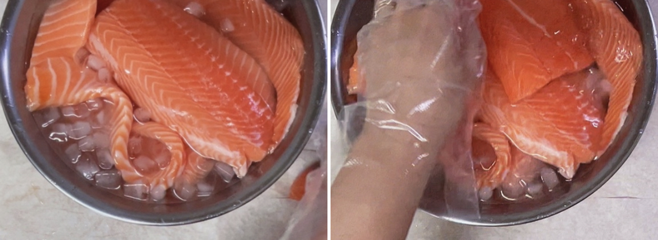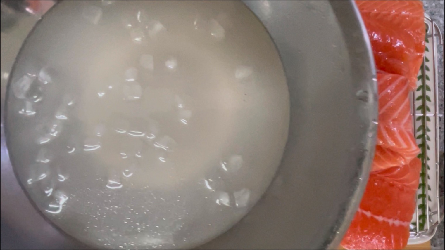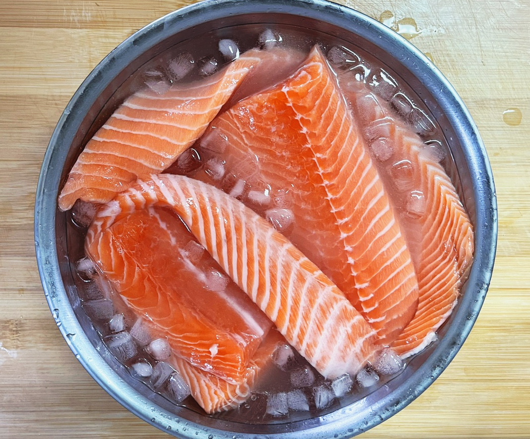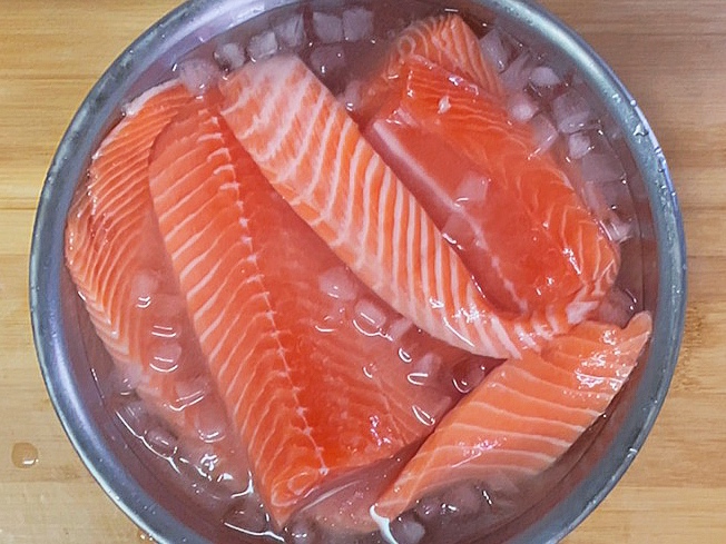 나눈 연어를 이소금 얼음물에 담궈줍니다.