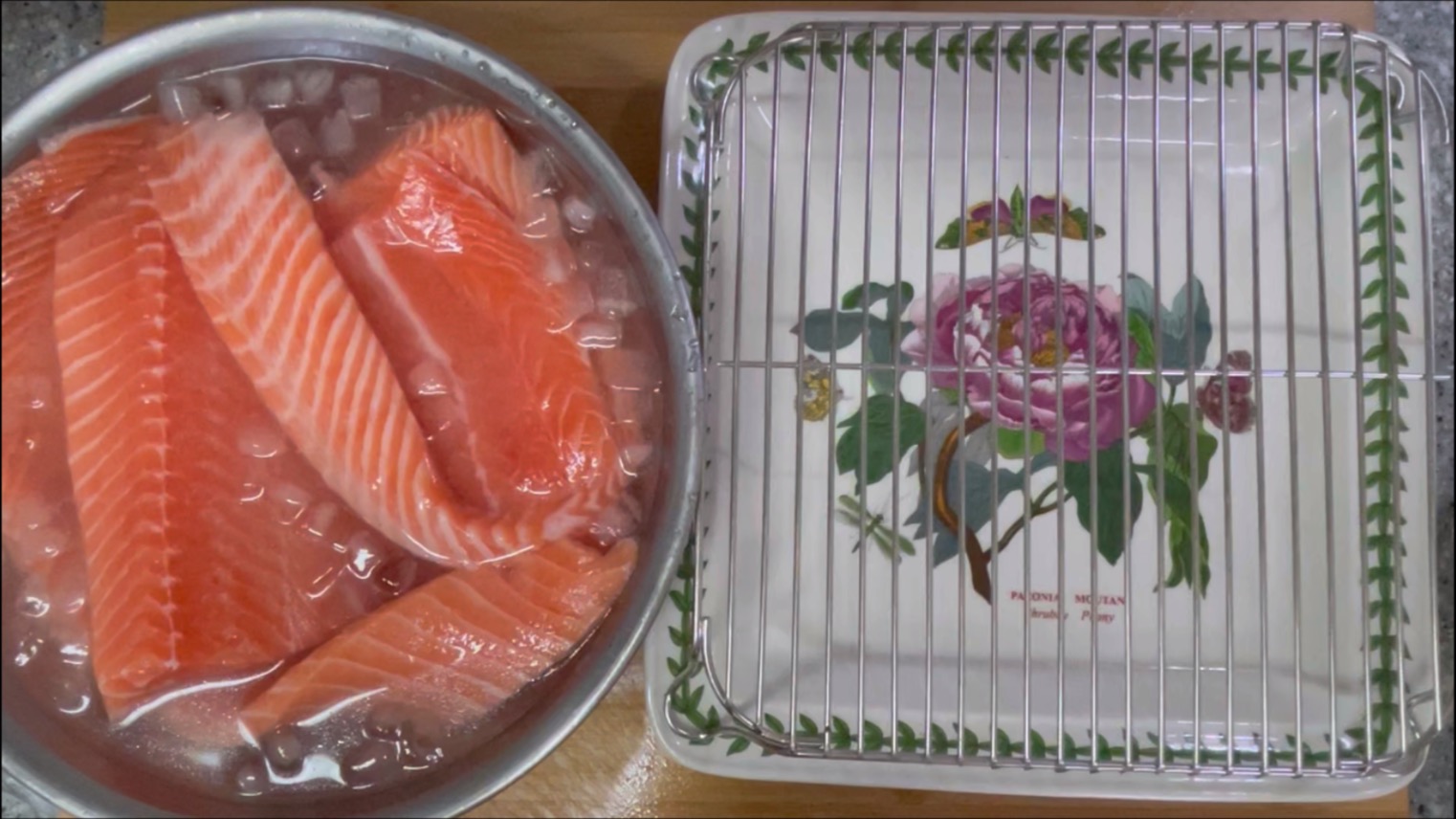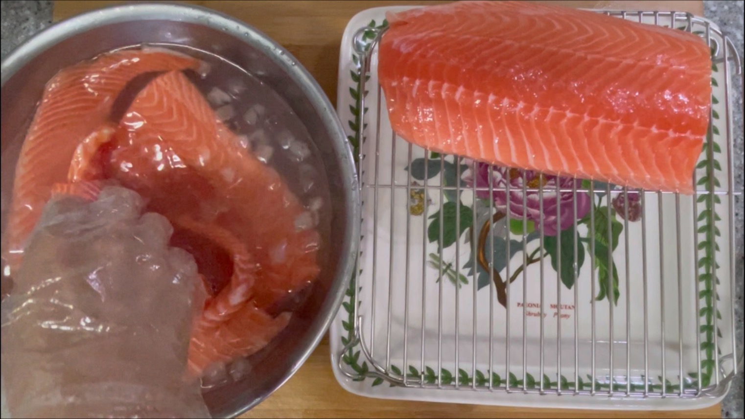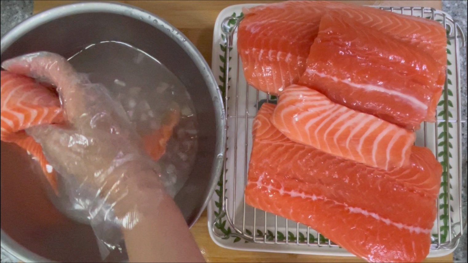 나눈 연어를 이소금 얼음물에 담궈줍니다.