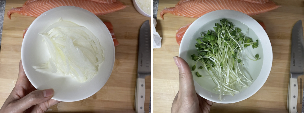 양파랑 무순을 찬물에 담궈놓습니다